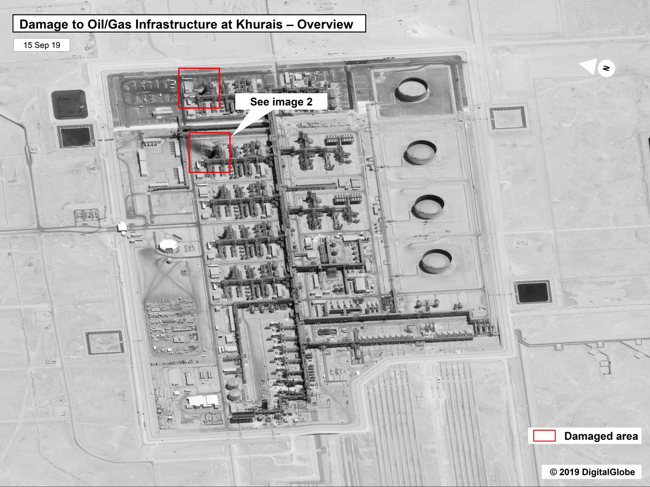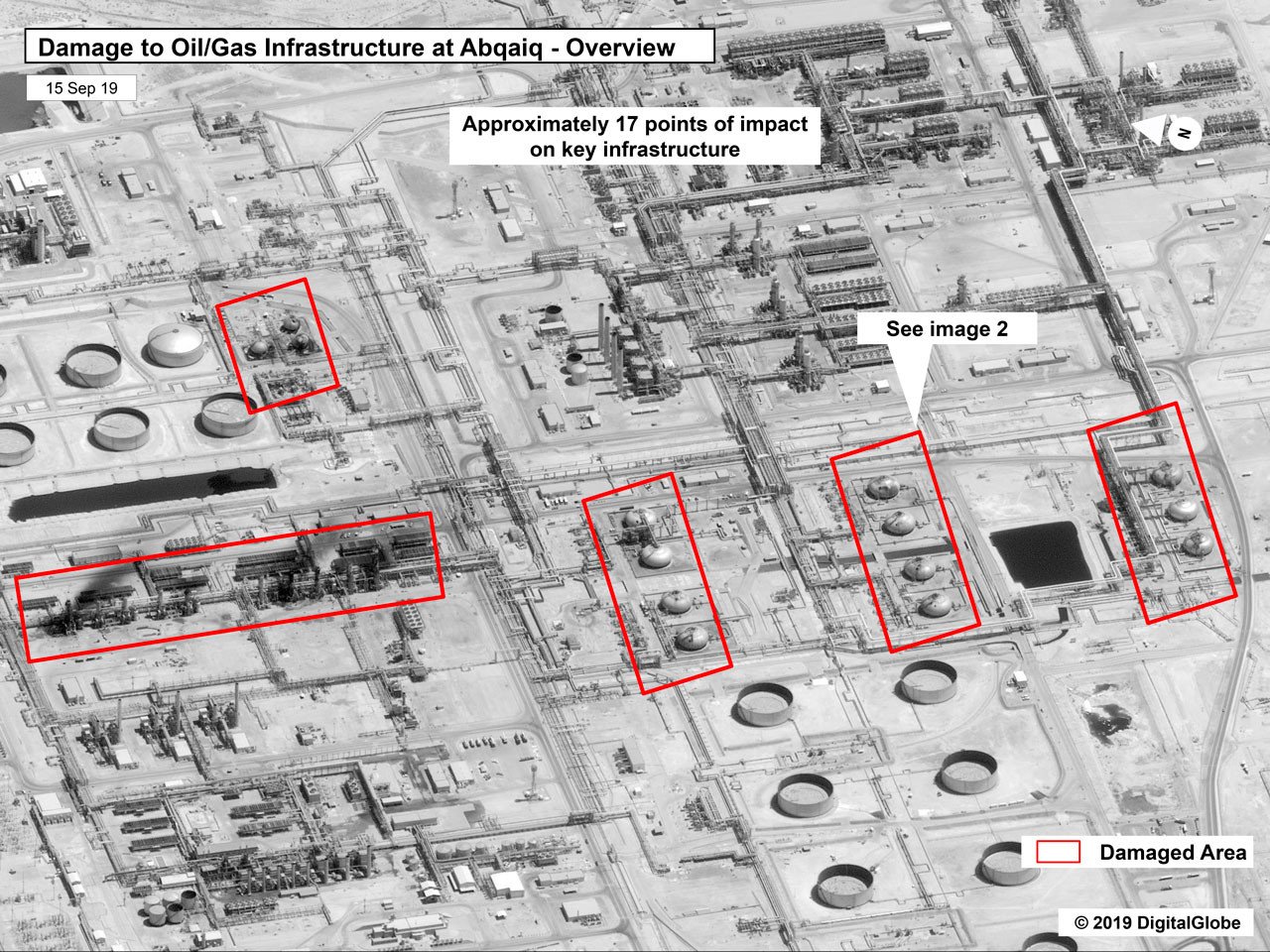 La Administración de EE.UU. publicó el pasado día domingo imágenes que muestran los daños causados por el ataque con drones contra la mayor planta de procesamiento de petróleo de Arabia Saudita. Las fotos satelitales muestran al menos 19 diferentes puntos de impacto en las instalaciones de Abqaiq y Khurais, en el oeste del país; ambas pertenecientes a la empresa estatal de petróleos Aramco y ubicadas en Buqyaq, Arabia Saudita.