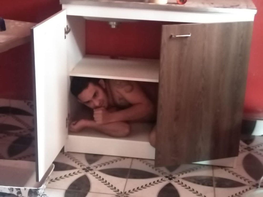 A otro de los capturados lo sacaron de un gabinete (mueble), bajo lo que parece ser un lavabo, donde se había escondido y permanecía en una incómoda posición.