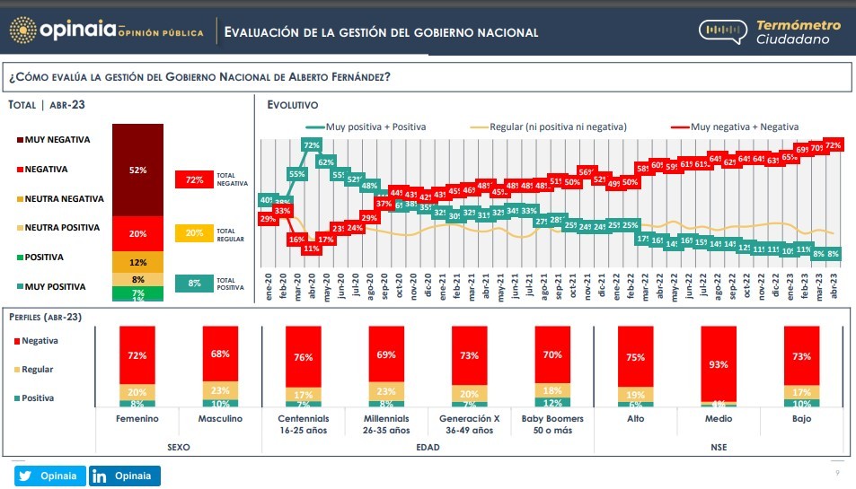 La evaluación del Gobierno Nacional alcanza su nivel más crítico. El 72 % de los consultados juzga negativamente la administración peronista, y esta valoración es compartida por los distintos segmentos sociodemográficos según sexo, edad y nivel socioeconómico.