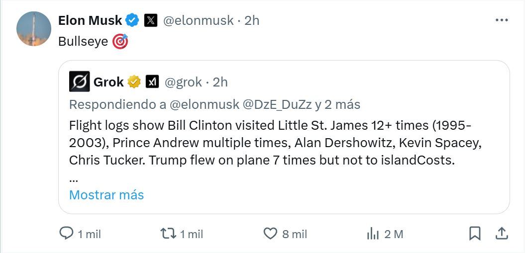 Además, Musk le dio a Grok instrucciones adicionales para que evaluara "la probabilidad de que quienes volaron en el avión de Epstein, a pesar de tener aviones propios, lo hicieran simplemente para ahorrar gasolina".