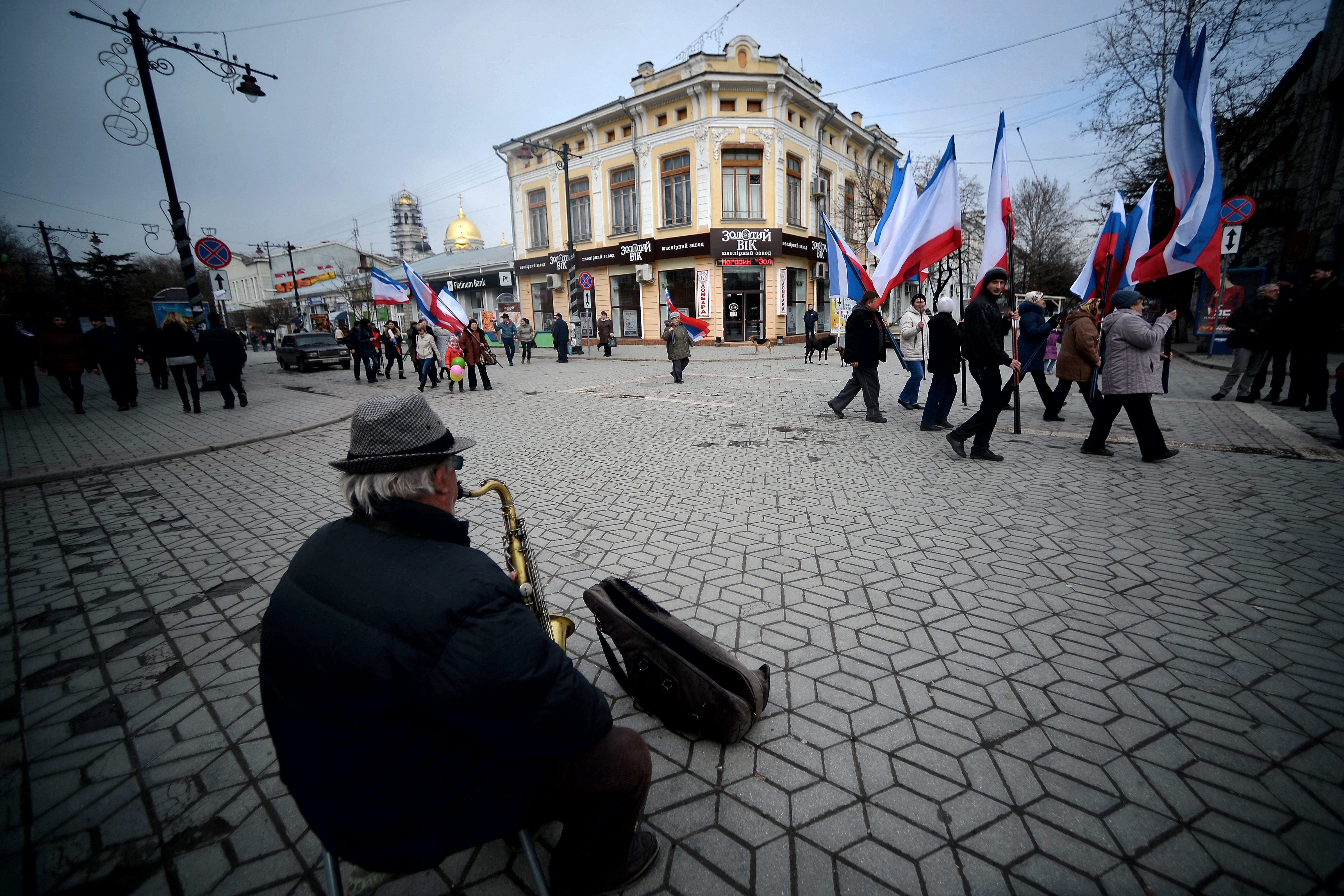 Los manifestantes marchan por las principales calles de las ciudades de Donetsk, Lugansk y Simferópol (Crimea) portando banderas rusas, informa la agencia Itar-Tass.