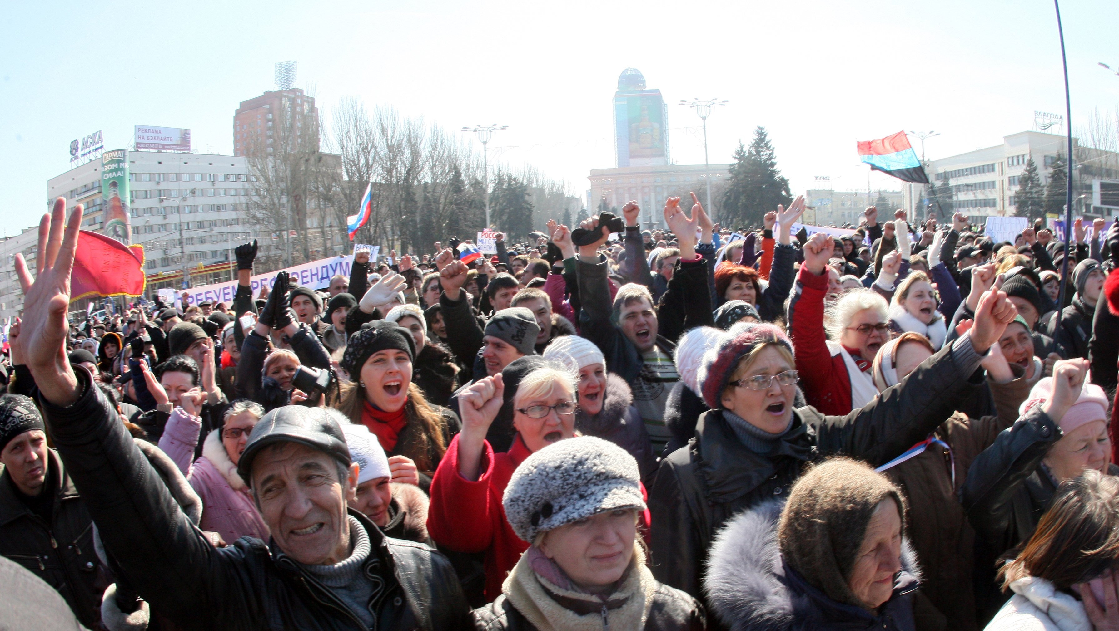 En varias ciudades de la región oriental de Ucrania se han celebrado multitudinarias manifestaciones a favor del referéndum para decidir su incorporación a la Federación de Rusia.