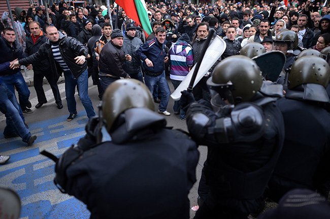 Los enfrentamientos con los policías se iniciaron cuando los manifestantes empezaron a lanzar huevos, tomates y petardos a la sede del Parlamento búlgaro y bloquearon el camino hacia una de las compañías de distribución de electricidad.