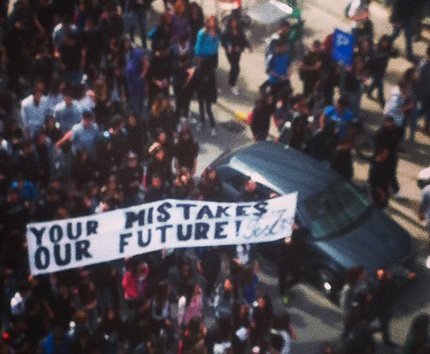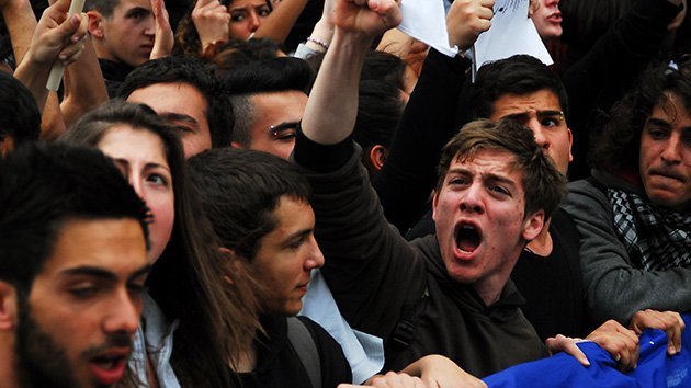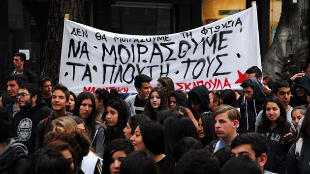 Más de mil estudiantes chipriotas corean "¡Troika, fuera de Chipre!", "Despiértate, te beben la sangre" y "¡Muerte a Merkel!".