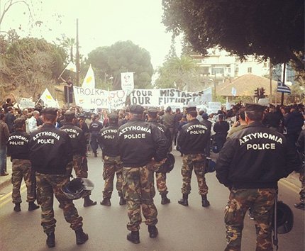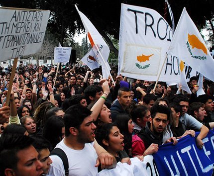 Los estudiantes chipriotas se han reunido frente a la sede del Parlamento de Chipre para manifestarse contra la política de la Troika de prestamistas internacionales.