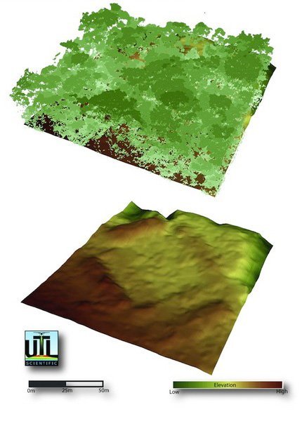 Instalada en un avión, la cámara transmite millones de unidades de datos que se procesan con un programa especial para obtener imágenes tridimensionales de la superficie y 'quitar' la capa arbórea.